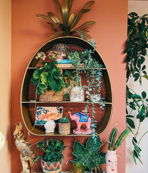 Αυθεντικό Boho στυλ, με δεκάδες φυτά, ιδιαίτερης αισθητικής αντικείμενα και υφασμάτινα στοιχεία κυρίως έντονα χρώματα, με τους πολλούς και διαφορετικούς τόνους του πράσινου και του σομόν-πορτοκαλί να κυριαρχούν.